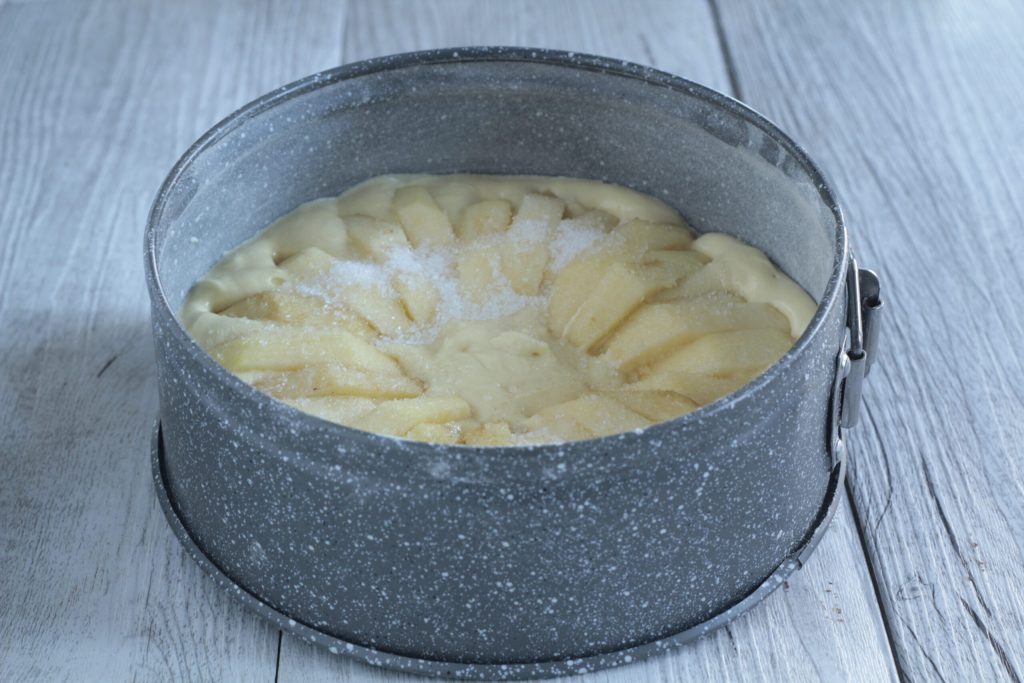 • Unte a forma, enfarinhe e despeje a massa da torta de maçã.