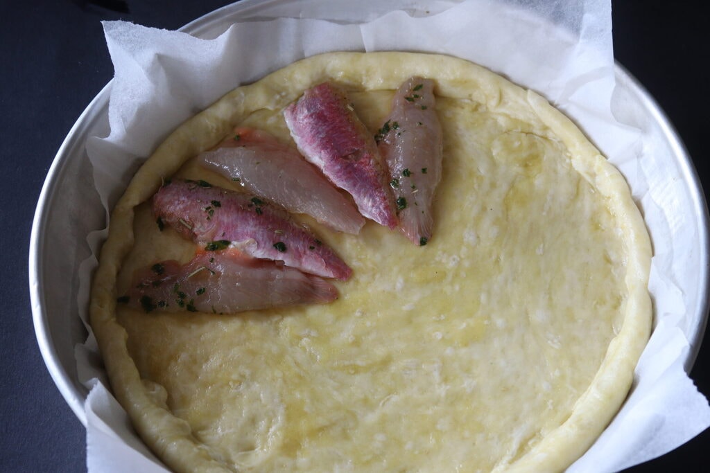 Coloque os salmonetes sobre a massa brisè em forma de leque.