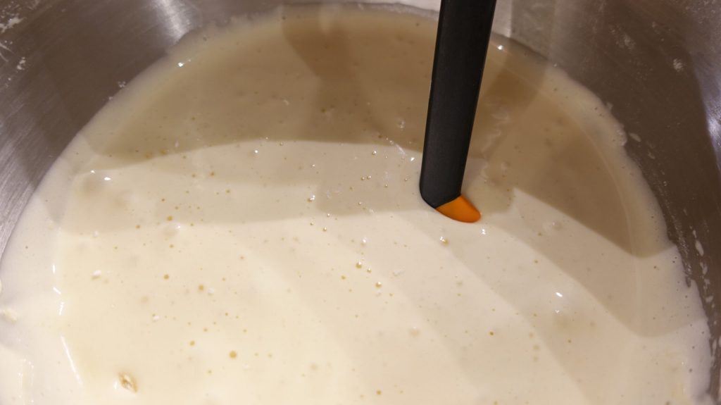 Adicione, sempre com a batedeira em ação, a farinha com o fermento.