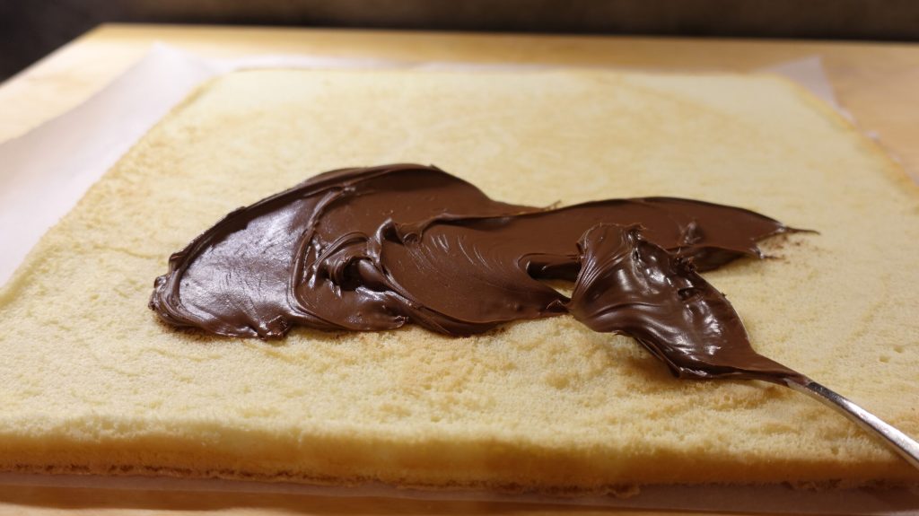 Retire o papel manteiga grudado à base do tronco. Espalhe uma camada de creme de avelã.