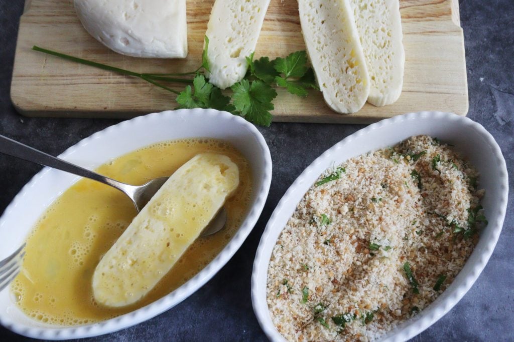 Coloquei o óleo na frigideira e aqueci a temperatura para 170°C. Uma a uma, fritei todas as fatias de tuma empanadas.