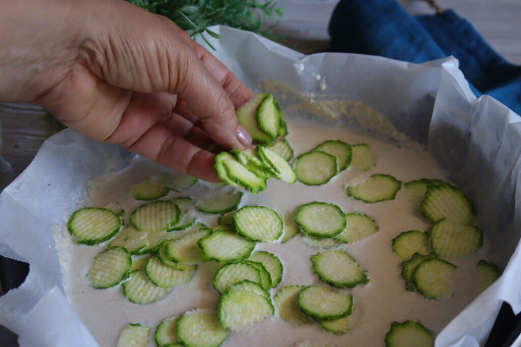 Com a mandolina, corte a abobrinha em fatias finas, claro, depois de lavá-la e remover as extremidades.