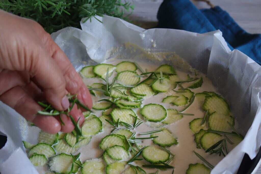 Distribua a abobrinha fatiada sobre a mistura de quinoa.