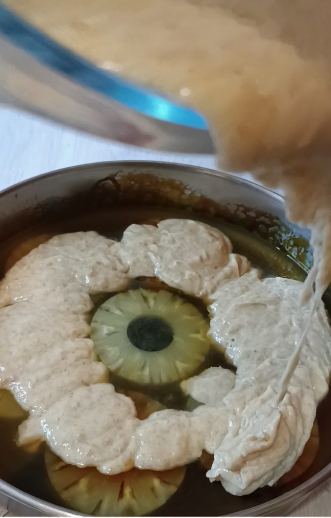 • Prepare o caramelo, ou use um caramelo pronto e despeje no fundo da forma; depois disponha o abacaxi conforme sua criatividade. Eu uso a versão clássica; neste ponto, despeje o suco do abacaxi, cerca de um copo, se tiver mais, pode regar o bolo após o cozimento. Coloque de lado até sua utilização
