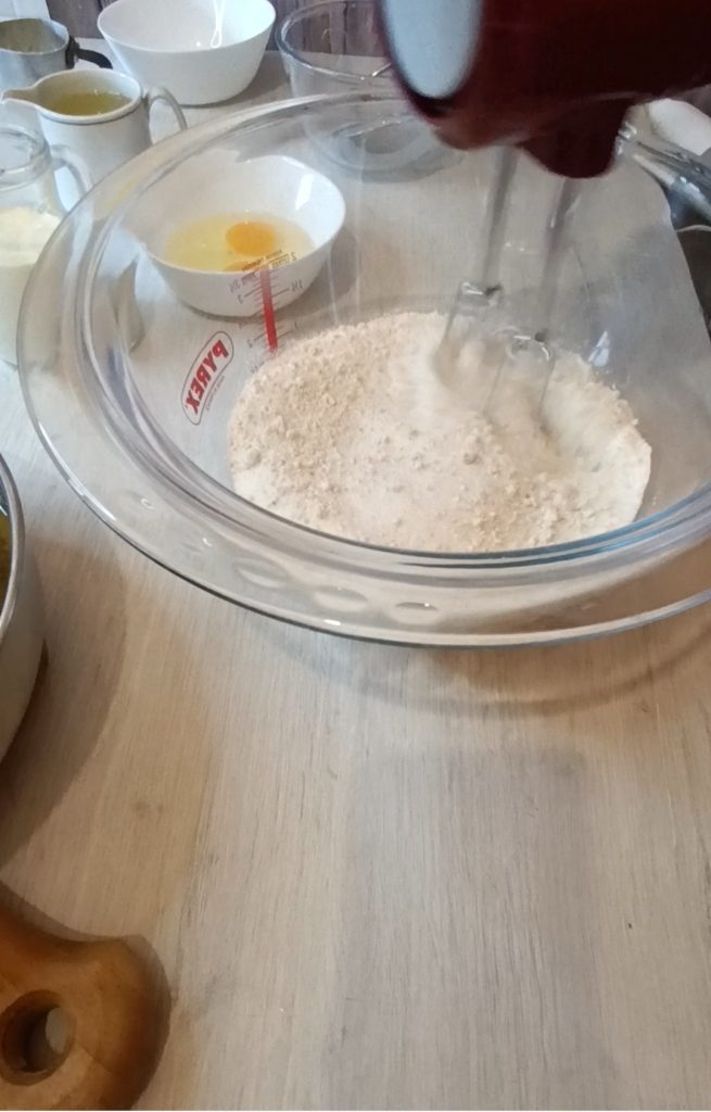 • Em uma tigela, coloque a farinha, o açúcar, o fermento peneirado e com as batedeiras elétricas, mexa para criar homogeneidade entre eles.