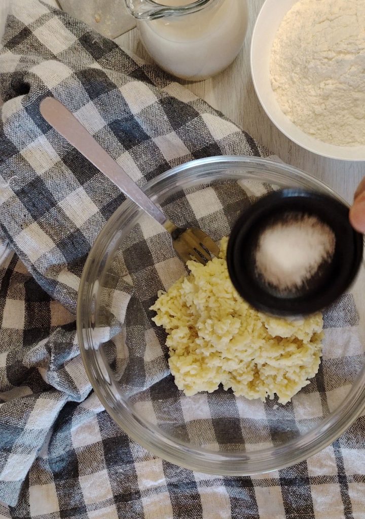 Depois de ferver as batatas, passe-as ainda quentes no espremedor de batatas e adicione o sal e um pouco de água com o fermento dissolvido dentro. Adicione a farinha alternando com um pouco de água de cada vez. Você deve obter uma mistura macia e elástica.