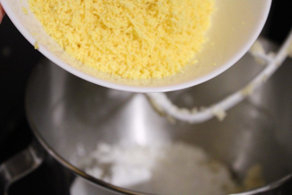 • Em seguida, adicione o açúcar e as gemas peneiradas finamente e os aromas. Trabalhe por alguns minutos até obter uma massa macia. A massa deve ser trabalhada o mínimo possível para preservar a maciez.