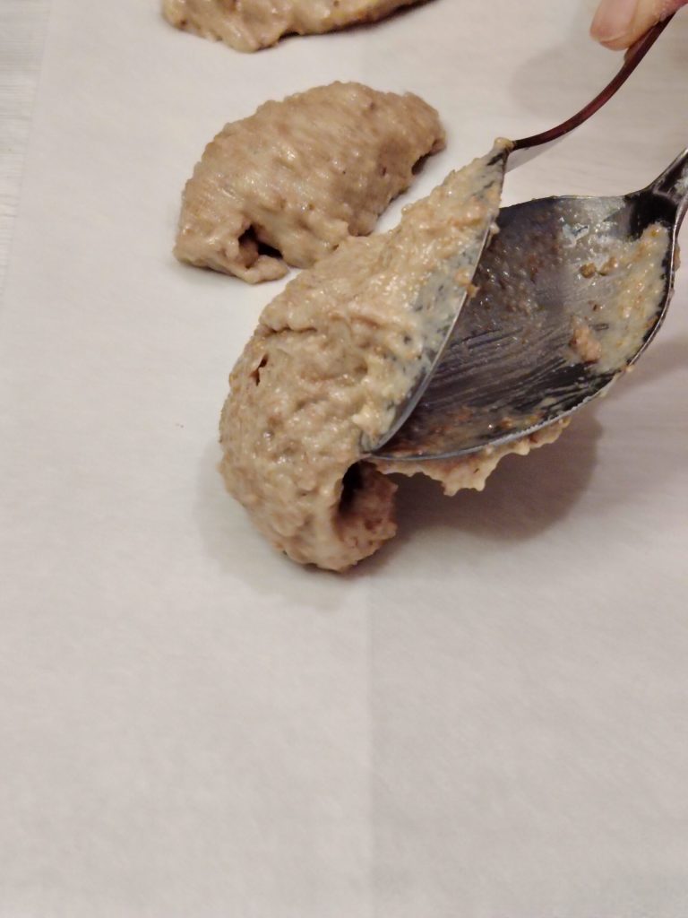Com a ajuda de duas colheres, transfira a massa para a assadeira. Durante o cozimento, o volume dobrará, por isso ajuste a distância. Você também pode moldá-los em forma de palitos.
