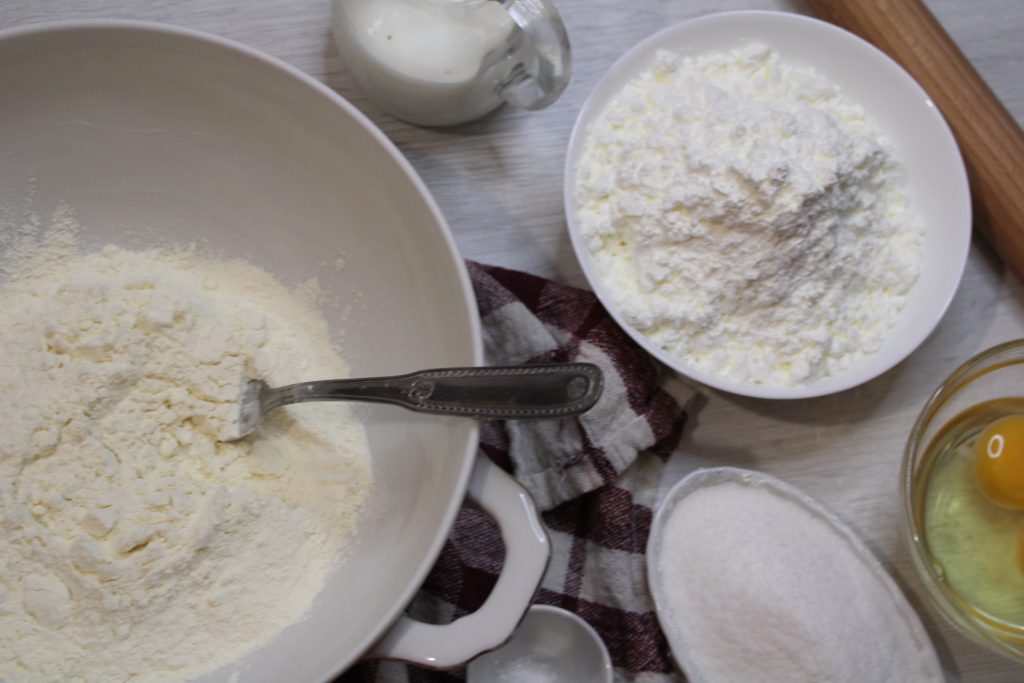 Em uma tigela, misture a farinha, a maizena, o açúcar e a amônia; misture bem e adicione: os ovos, o leite e o óleo. Primeiro com um garfo e depois com as mãos, amasse a mistura.