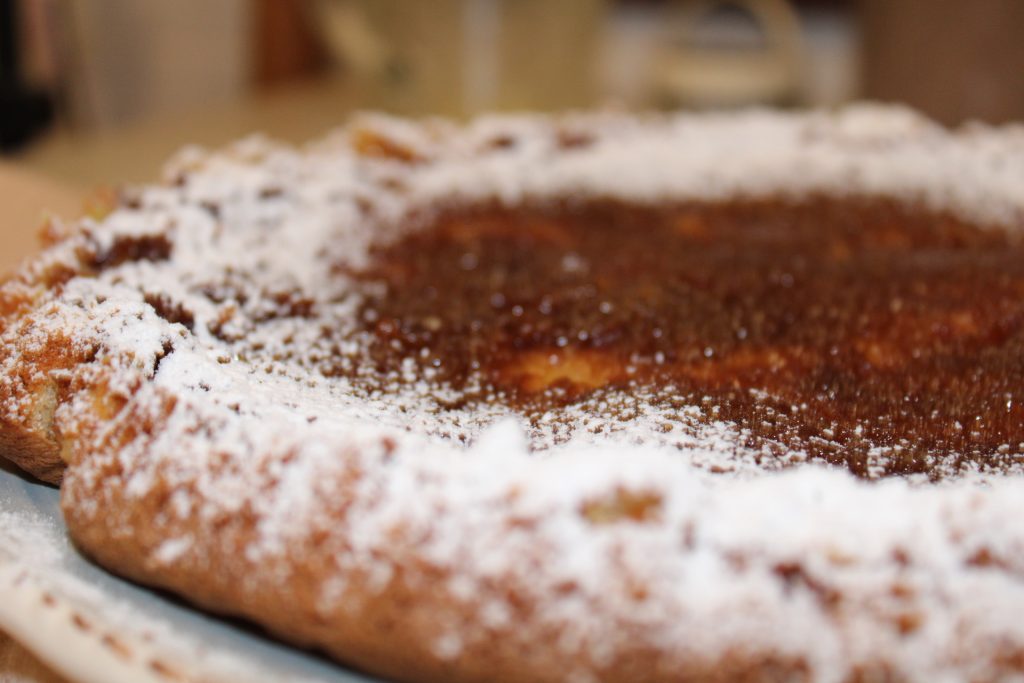 Foi assim que nasceu este bolo de maçã, de tardes dedicadas ao descanso, à casa e à natureza. A geleia usada, de preferência, é de pêssego ou de damasco, ou ameixas colhidas na árvore em frente de casa, que todo ano dá muitas, docinhas e suculentas, como se fossem cerejas. Aqui a gente chama de ramassin; há outros nomes também; são as mesmas que você encontra pelos trilhos nos bosques perto das casas.