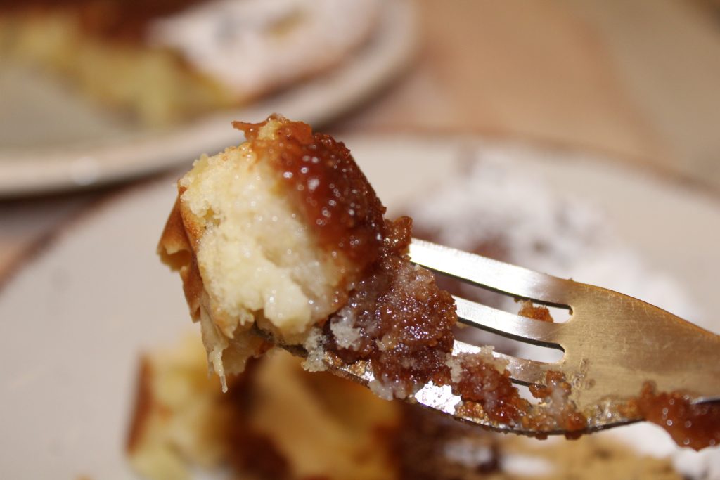 Bolo de maçã invertido com amaretti e geleia. O bolo de maçã é sempre bom, não sei dizer quantas versões existem, certamente centenas. Um doce que sempre cai bem, sempre conforta.