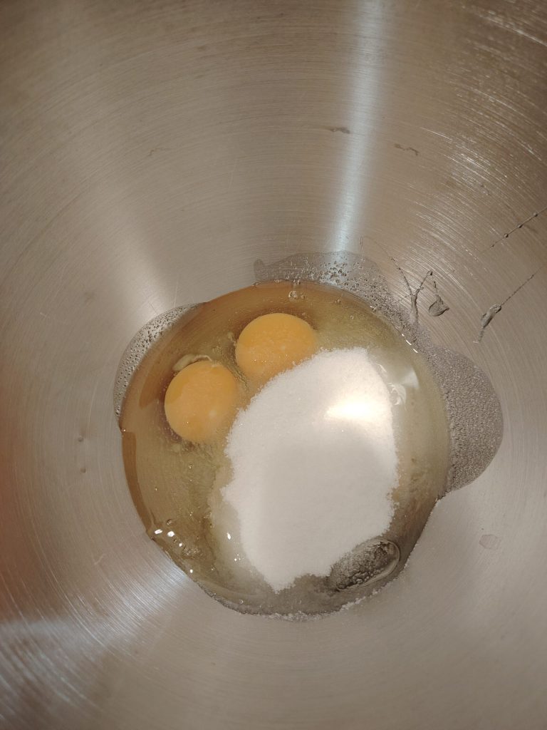 Na batedeira ou numa tigela, bata os ovos com o açúcar até obter um composto espumoso. Vai levar cerca de seis minutos.