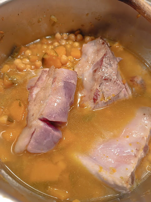 • Enquanto a sopa começa a cozinhar, doure as costelas de porco e adicione ao restante…