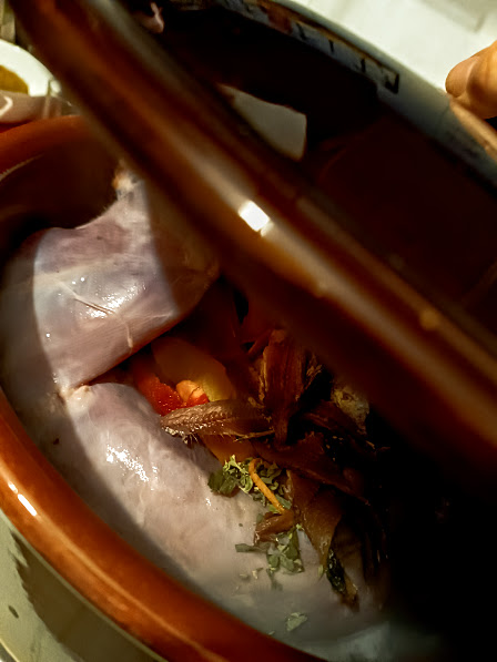 Feche com a tampa e vá para o cozimento; o coelho vai cozinhar lentamente, os vegetais vão se desfazer completamente; se necessário, adicione pouquíssima água durante o cozimento, mantenha o fogão em baixa intensidade; Quando você perceber que o coelho começa a grudar na panela, não adicione líquido, mas deixe dourar, acrescente um copo de água e a manteiga com a farinha que você preparará anteriormente misturando-os juntos; Eles darão um toque adicional de densidade ao molhinho final.