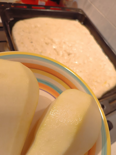 Depois de misturar os ingredientes, deixei a focaccia descansar por dez horas, permitindo que os aromas se desenvolvessem e o pão ficasse macio e leve. Durante a fermentação, espalhei a massa em uma assadeira e a cobri com fatias abundantes de peras Abate. Esta variedade de peras, com sua polpa doce e suculenta, combina perfeitamente com a intensidade do gorgonzola.