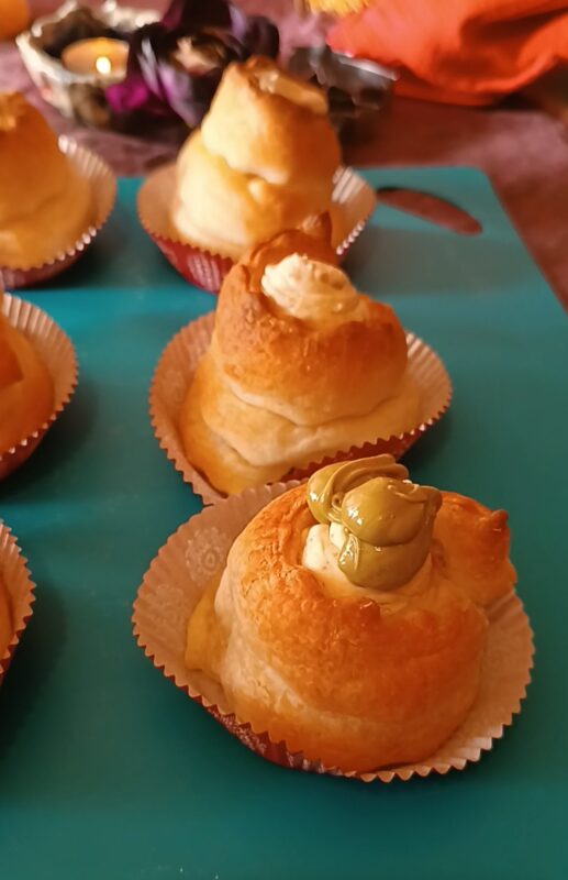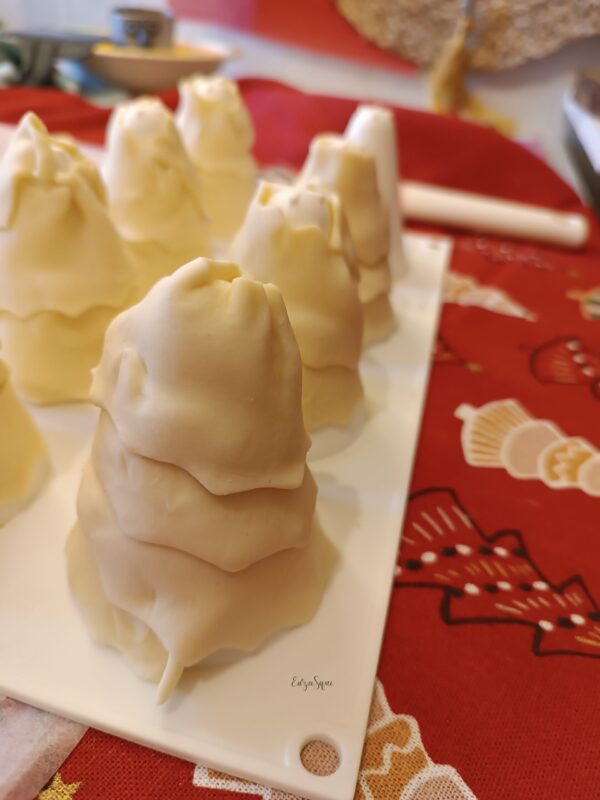A ideia, como você vê na foto, era refazer a receita original, como a criei algum tempo atrás; infelizmente, não tenho a fotografia para mostrar a forma original, que deveria ser uma árvore de massa folhada; mas na cozinha as variações são muitas… Eu mudei o molde, pensando que me ajudaria a fazer melhor. Não calculei as variações… Paciência, assim que puder, colocarei a foto das arvorezinhas.