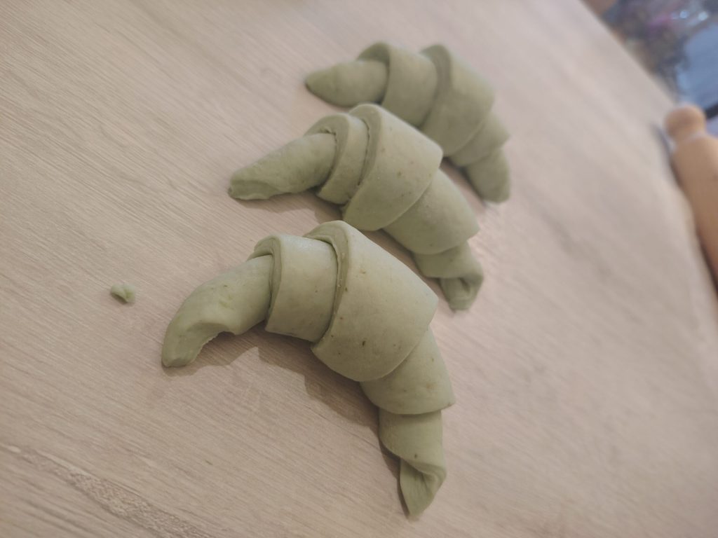 Croissants doces muito fáceis e verdes. Ideais para aperitivos e buffet, para fugir do habitual sanduíche. Para colorir as festas dos pequenos, para uma mesa saborosa. Com a mesma massa, você pode dar formas diferentes. A coloração é totalmente natural, salsinha e manjericão finamente batidos, amarela com cúrcuma, marrom com cacau.