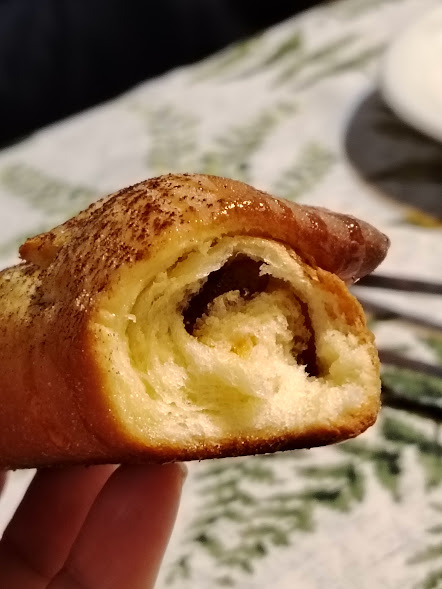 Um croissant para rechear com cremes ou geleias, como eu fiz. Frutas cristalizadas, uvas passas e gelatina de laranja.