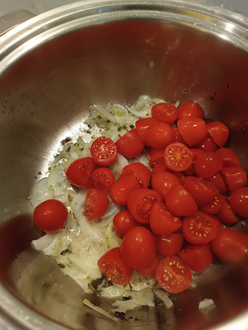 • Uma parte das cebolas e meio dente de alho picado, refogue em pouco azeite e depois adicione os tomatinhos cortados ao meio e deixe cozinhar por cerca de dez minutos, adicione o orégano perto do final e ajuste o sal.