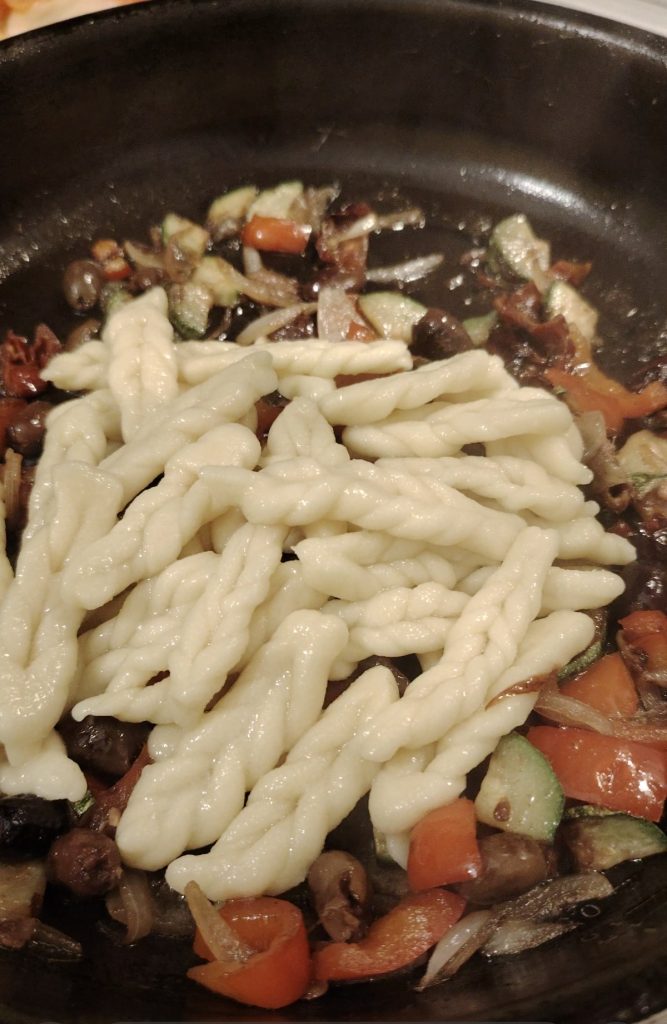 • em uma frigideira com azeite de oliva, adicione os vegetais cortados em pedaços, incluindo os tomates secos, as azeitonas, as alcaparras, as anchovas desfiadas e deixe dourar lentamente enquanto leva a água para a massa a ferver.