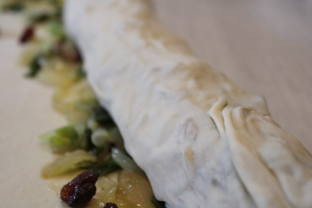 Para enrolar a folha coloque-a antes de rechear sobre um pano ou papel manteiga, isso vai facilitar a operação. Assim que pronta, pincele mais azeite, a crosta ficará ainda mais convidativa. Se gostar, pode também acrescentar alguns ramos de funcho selvagem