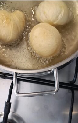pequenas esferas de felicidade amassada, no óleo fervente começaram a dança: