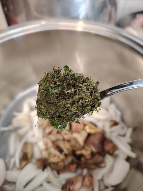 - 1 chávena de chá cogumelos (Eu os coloco mistos. uso os cogumelos colhidos e conservados no freezer após escaldá-los. Também são bons cogumelos secos.)