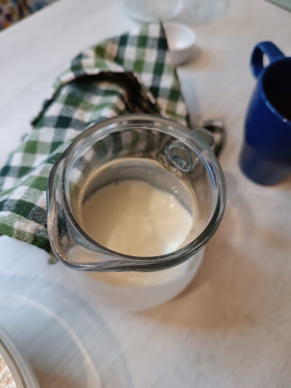 Misturar o leite, o iogurte e o limão, cobrir com um pano de prato e deixar descansar por cerca de dez minutos, em temperatura ambiente.