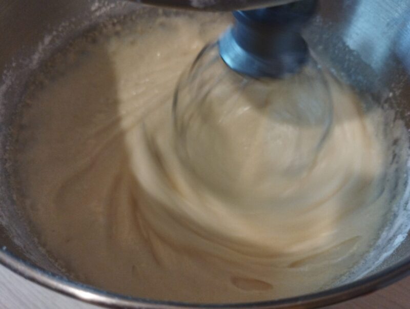 Quando a sua espuma estiver pronta, abaixe a velocidade da planetária ou batedores, e adicione as duas farinhas, misture cuidadosamente de baixo para cima.