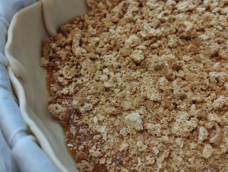 Enquanto isso, forre a forma com a massa folhada; o segundo disco será para a decoração. Despeje a geleia de damasco e distribua bem no fundo
