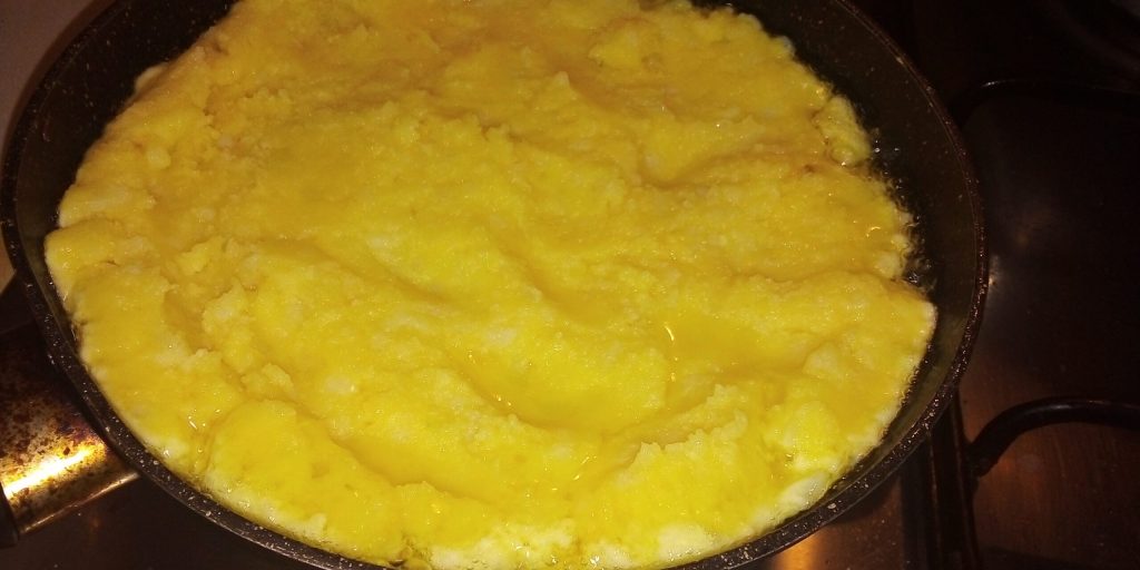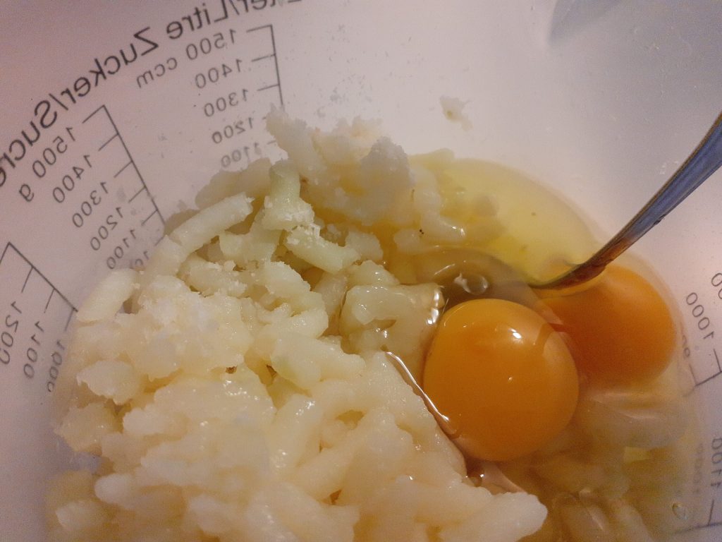 Passar as batatas e misturar os ovos, o pecorino e sal. Misture bem.