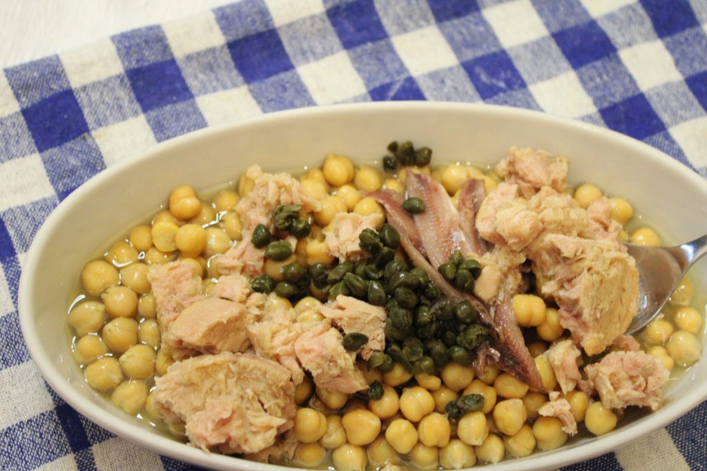 Grão-de-bico cozido, atum, anchovas e alcaparras.