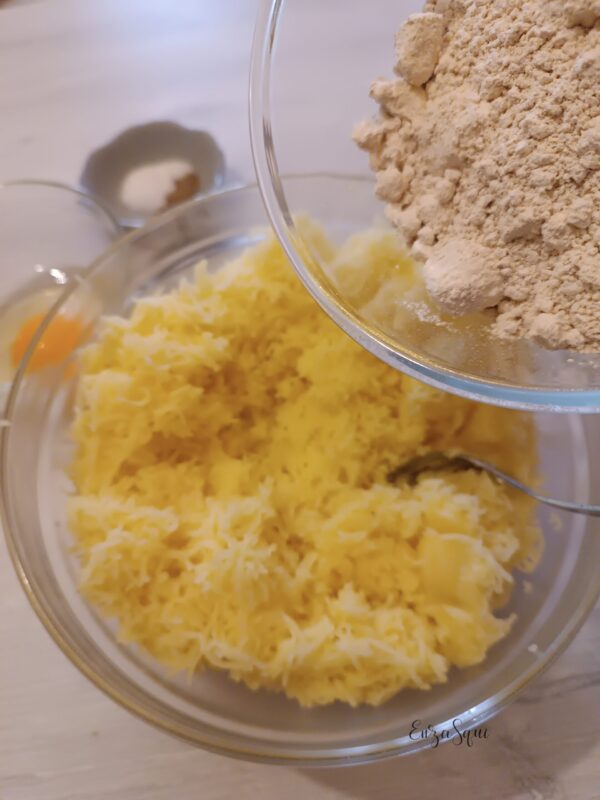 Depois de ferver as batatas com a casca, faça um purê e coloque em uma tigela, adicione a farinha de castanhas