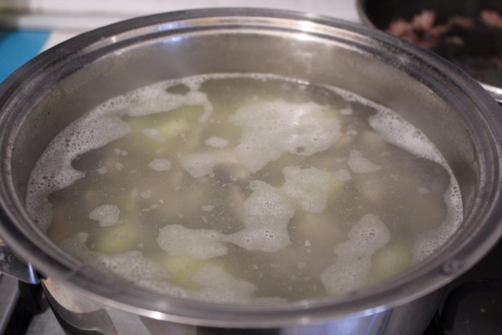 • Prepare tudo o que você precisa. Como primeira operação, amasse as duas farinhas com 5 gramas de sal e cerca de 100 ml de água; uma vez que você tenha uma boa massa, estenda até uma espessura de cerca de 2 mm e corte em tiras de meio cm x 6, como você vê na foto; enfarinhe e deixe descansar até sua utilização. Em uma panela, coloque a água para o cozimento e adicione as batatas cortadas em pedaços.