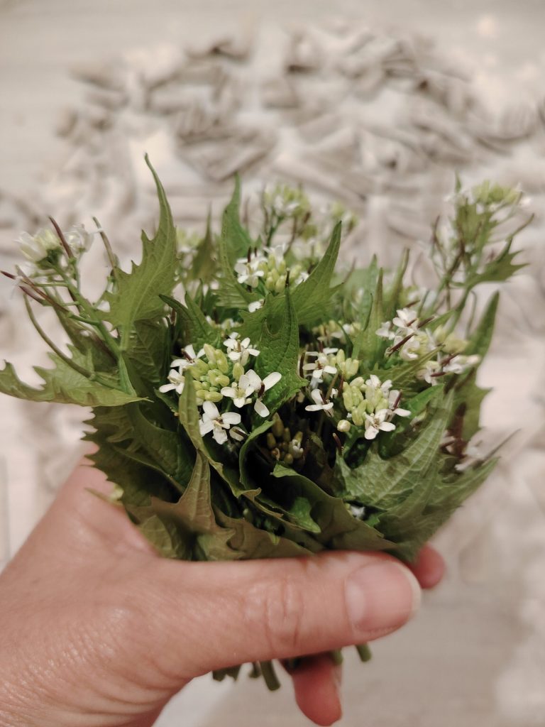 Pizzoccheri com pesto de alliaria. Nesta temporada, os caminhos perto de casa estão cheios de alliaria; assim, após colher para o consumo do dia, pensei em fazer um bom pesto para temperar os pizzoccheri. Não é necessário colher mais do que o necessário: basta pouco para se alimentar, é inútil fazer colheitas abundantes que não serão utilizadas. Tenho centenas de receitas para preparar, prefiro seguir as estações e as colheitas que aparecem a cada dia. Assim tenho a possibilidade de variar.
