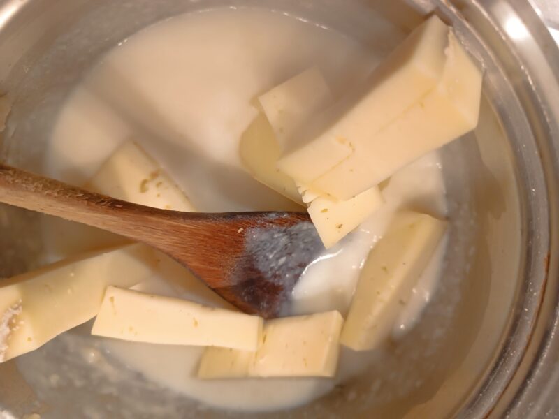 Adicionei uma alternativa preparando uma fonduta de queijo toma piemontês, deixei o toma de molho no leite por cerca de meia hora e depois derreti em fogo baixo, você também pode usar banho-maria para não correr o risco de queimar.