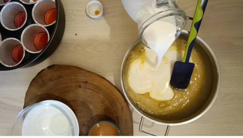 Agora você pode despejar a mistura nas forminhas e adicionar a água para o banho-maria. Asse em forno pré-aquecido a 200 graus até cozinhar. Se colocar no forno frio, aumente o tempo de cozimento, que se nota pela consistência e cor; faça sempre o teste do palito…