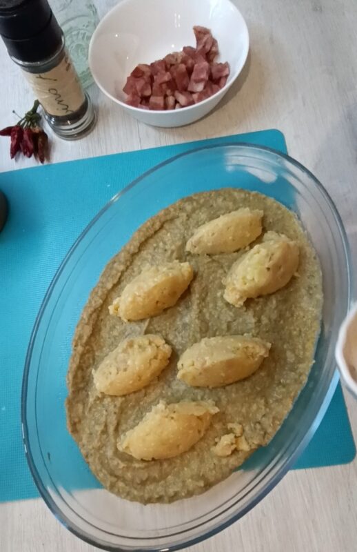 • Transfira para a assadeira, primeiro o creme de grão-de-bico e lentilhas, depois forme as quenelles com a ajuda de duas colheres