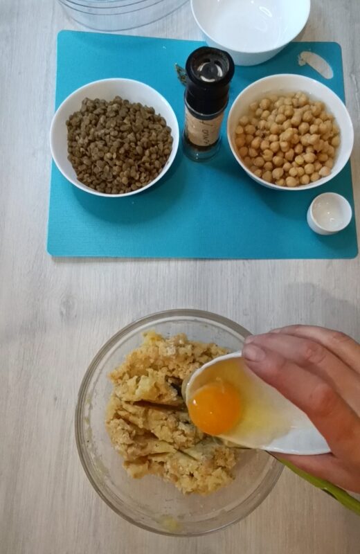 • Depois de preparar todos os ingredientes, junte em uma tigela, metade dos grãos-de-bico cozidos e as batatas amassadas com um garfo até formar um purê granular