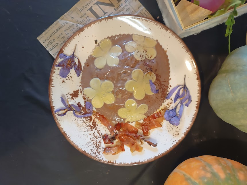 O cacau estará presente tanto na massa como cor natural, quanto no tempero final, para proporcionar uma nota amarga e intensificar a cor do tempero.