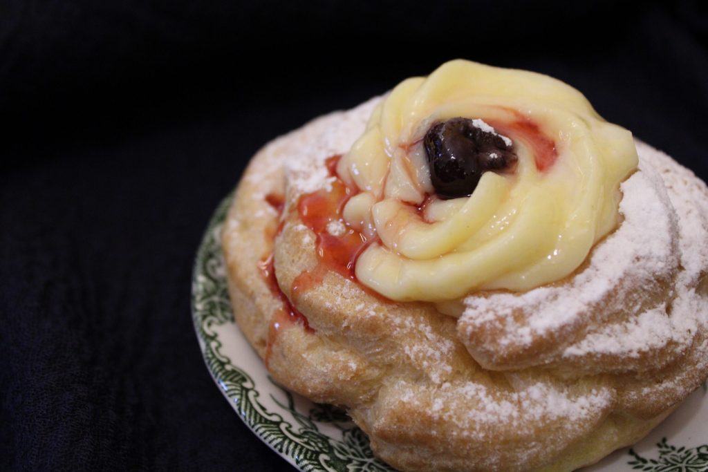 Certamente a receita das zeppole percorreu um longo caminho, a atribuição da receita original ainda é pouco clara, mas há diferentes personagens envolvidos. Parece que a primeira receita foi escrita por Ippolito Cavalcanti, em língua napolitana em 1837. Uma massa simples de apenas farinha e água aromatizada com anis ou marsala. Fritas em óleo quente e consumidas com uma bela passada de açúcar na superfície. Com o tempo, os ingredientes foram modificados para poderem ser assados, o que parece ser mais leve. Na cozinha napolitana, muitas receitas eram domínio dos mosteiros, as freiras tinham uma bela inventividade para renovar receitas que lhes eram convenientes. A receita original prevê a massa frita, mas hoje se sabe que fritura não é propriamente saudável, então a receita foi aliviada fazendo a cocção no forno. Hoje em dia, as zeppole são conhecidas em toda a Itália, algumas são recheadas com ricota, outras com creme de confeiteiro. Esta versão tem um creme de confeiteiro enriquecido com creme de leite, conferindo cremosidade. Usei para guarnecer minhas últimas cerejas cristalizadas, e morangos para adicionar cor, a um doce decididamente primaveril e delicioso. Esta versão já uso há muitos anos, quando fui a Roma e um amigo confeiteiro me fez entrar no seu reino. Era janeiro e as zeppole estavam em destaque na vitrine, e não podíamos deixar de provar tanta delícia.