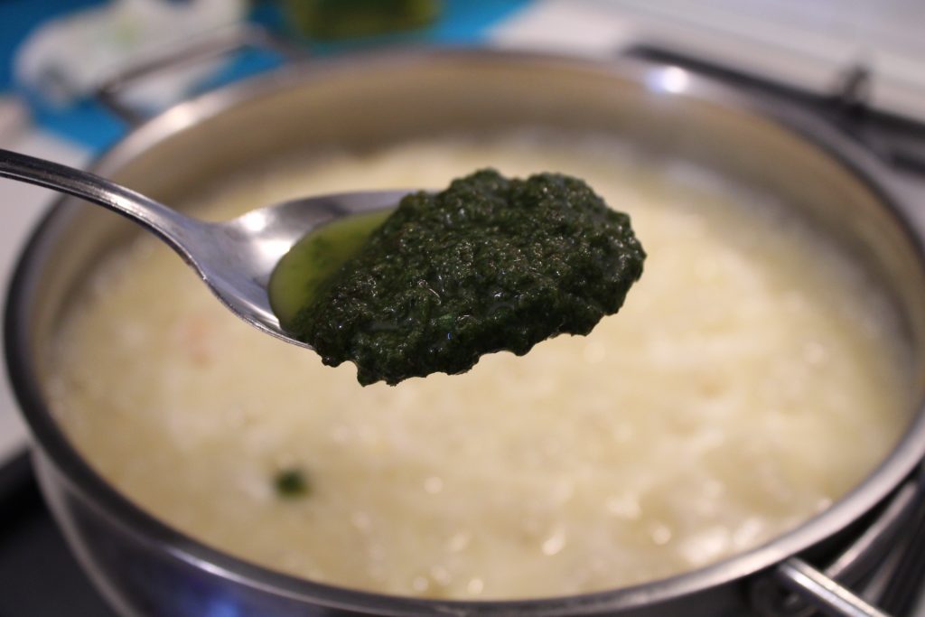 • Enquanto cozinha, prepare o pesto com as ervas aromáticas, azeite e sal; próximo ao final do cozimento do arroz, ajuste o sal e adicione o pesto, misture bem e…