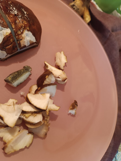O céu claro e o aroma de grama fresca nos envolviam enquanto decidíamos nos aventurar por novos caminhos com um pouco de entusiasmo e curiosidade, dirigimo-nos a Sanfront para procurar o caminho que nos levaria a Balma Boves, um lugar que prometia segredos e histórias esquecidas. Depois de estacionar o carro, começamos a subir por um caminho ladeado por avelãs e castanheiras centenárias. A natureza, com suas rochas salientes, parecia nos acolher, enquanto o sol filtrava pelas copas das árvores. Finalmente chegando à vila, nossos olhos se abriram diante deste assentamento característico construído sob uma imponente saliência rochosa, uma atmosfera que falava de história e tradição. Durante esta aventura, tivemos a sorte de poder colher alguns cogumelos, decidindo usá-los para o almoço, prevendo um risoto