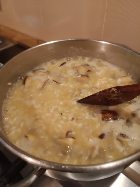Em uma caçarola, refogue os cogumelos com pequenos ramos de tomilho que você eliminará depois, adicione o arroz, toste bem e…
