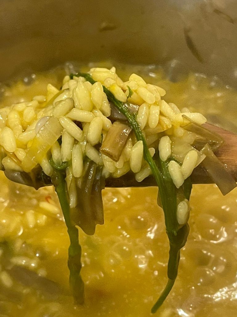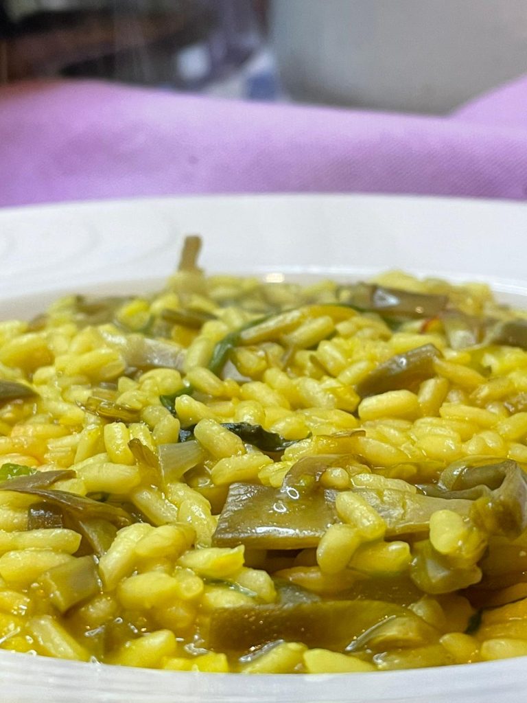 Risoto de alcachofras e açafrão. Colhi nada menos que seis alcachofras na minha pequena horta, uma verdadeira alegria, considerando o tamanho da planta.
