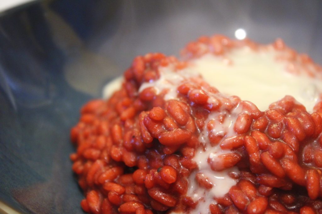 Você também pode usar caldo de carne, se preferir. Eu uso arroz carnaroli e deixo levemente al dente. Não finalizei com manteiga para não pesar; e não adicionei parmesão para destacar o gorgonzola em sua pureza. Beterrabas assadas no forno vão oferecer um toque aromático um pouco diferente; às vezes eu as cozinho no forno da estufa a lenha e sai uma nota defumada. Eu prefiro o gorgonzola mais marcante, pois as beterrabas são doces e combinam bem.
