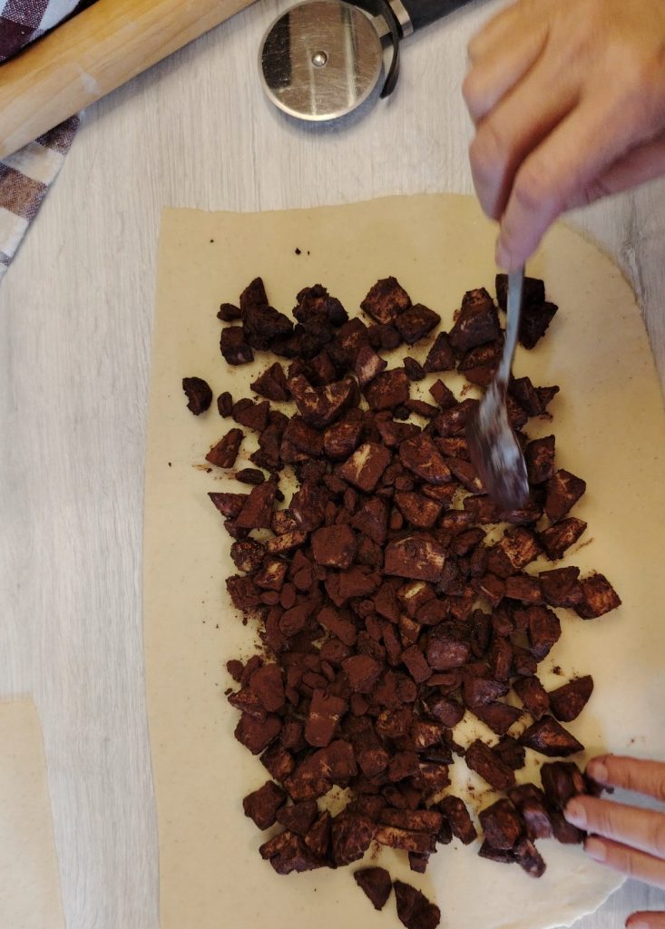 Depois do tempo necessário, estenda em uma folha retangular e organize o recheio.
