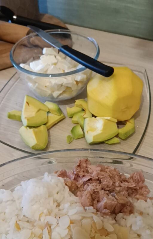 Adicione a manga, o abacate, o atum, os tomatinhos, o milho e a feta…