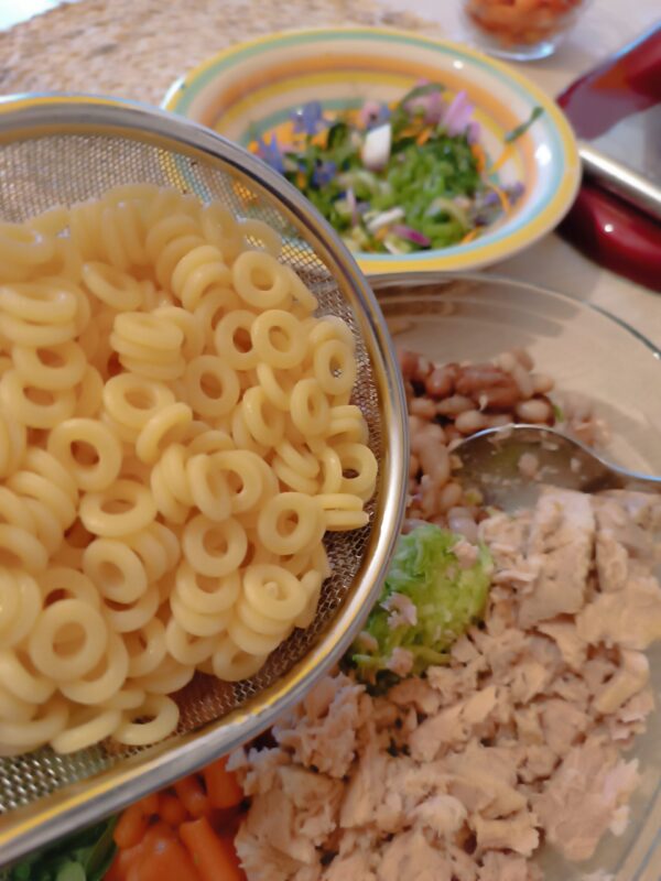 • Antes de tudo, coloque a panela com água salgada para cozinhar a massa, eu escolhi os anelini sicilianos, que mantêm a forma ao cozinhar e são um bom formato para saladas.