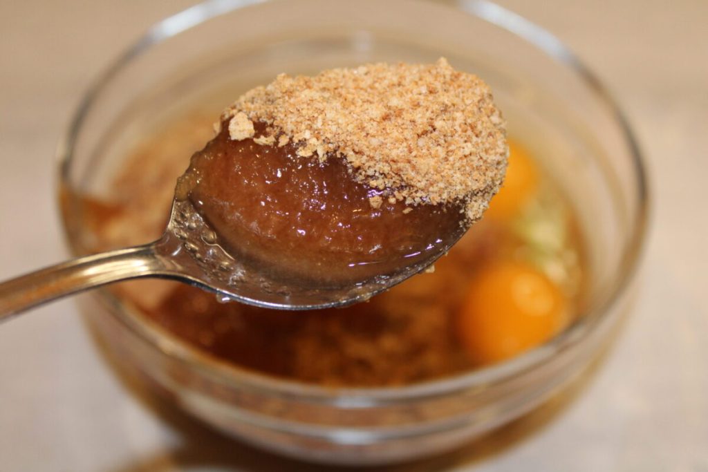 • Prepare o recheio; triture grosseiramente os amaretti e adicione à compota de peras; acrescente os ovos e misture bem